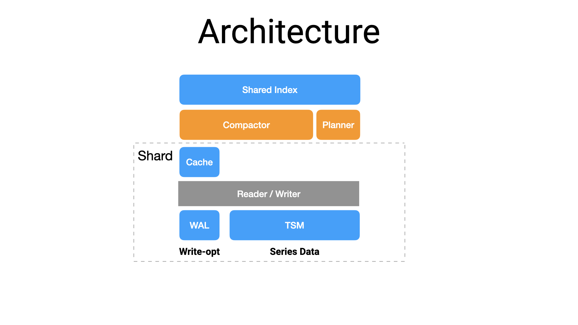 下图展示是存储引擎包含的几个主要的组件,需要注意的是 WALTSM 的本质是文件,只不过 WAL 是对快速写入进行优化的只进行追加写的数据文件,TSM 是对快速读取进行优化的只读数据文件。在它们的上层的其他组件都是存在于内存中,由运行时构建。